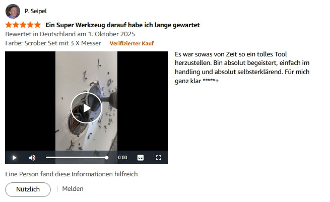 Ja, seit 2018 wurden vier Jahre lang Tests zur Verbesserung des SCROBER-Bohrers durchgeführt, damit er seine Funktion zu 100% erfüllt. Wir garantieren, dass der Überstand der Unterputzdose in 10 Sekunden abgeschnitten wird!